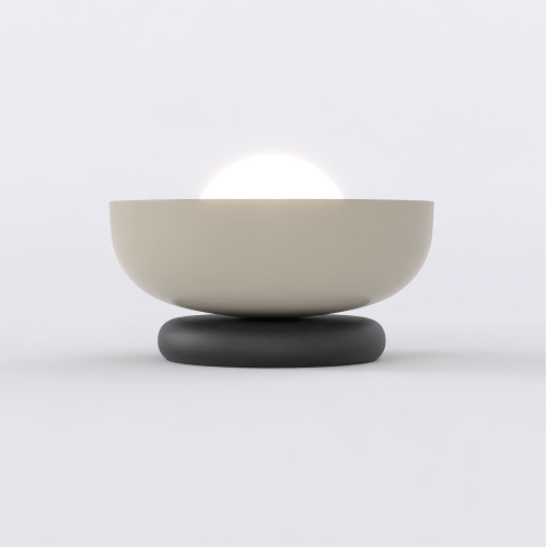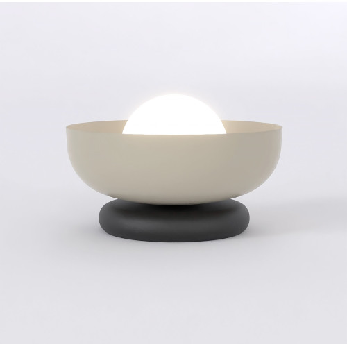Modern table lamp in a minimalist style from the series Ozzy, made of a black colour round metal base and a dome-shaped metal shade in beige colour with an opal glass diffuser in a spherical shape. Quality lamp, suitable for original lighting in your living room, dining room, bedroom, hotel or restaurant.