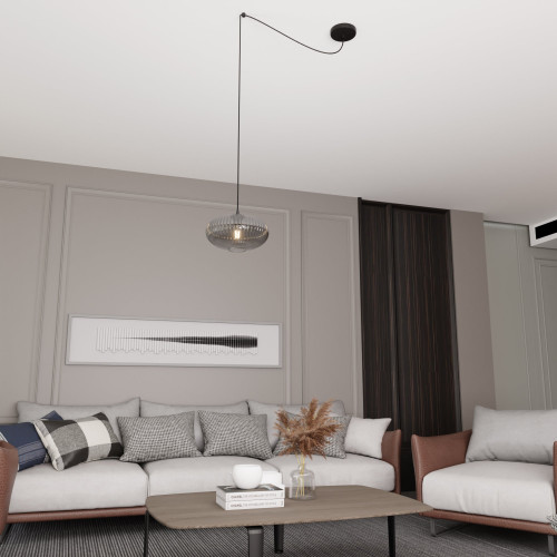 Original pendant lamp with a modern design from the series Origo, made of a black colour round metal base and spherical ribbed glass shade in graphite colour hanging on cable with the ability to adjust the height and a variety of hanging options. Stylish proposal for interior lighting in your living room, dining room, hotel and restaurant.