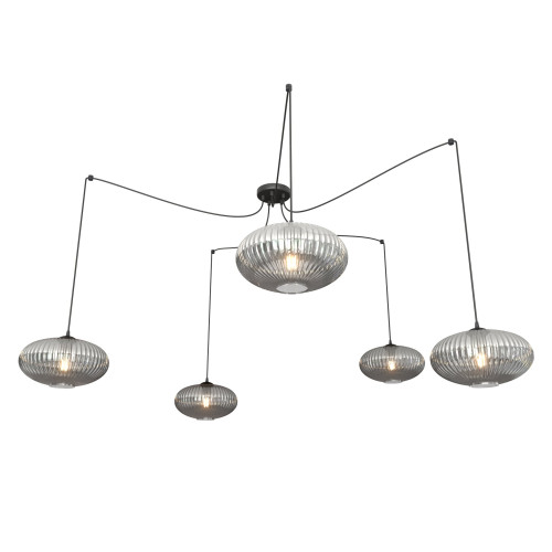 Original pendant lamp with a modern design from the series Origo, made of a black colour round metal base and five spherical ribbed glass shades in graphite colour hanging on cables with the ability to adjust the height and a variety of hanging options. Stylish proposal for interior lighting in your living room, dining room, hotel and restaurant.