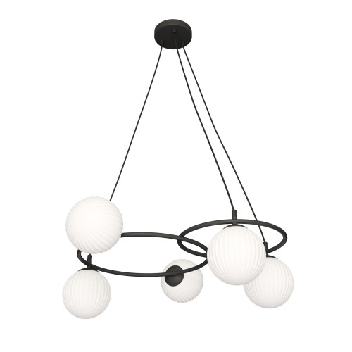 Elegant pendant lamp with a modern design from the series Libra, made of a black colour metal base and a hanging body of two metal rings with five spherically shaped ribbed glass shades in opal white colour. An original solution for interior lighting in your living room, dining room, hotel and restaurant.