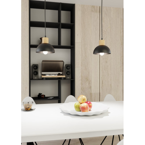Modern pendant lamp in Scandinavian style from the series Seco, made of a black colour round metal base and black metal shade in a dome shape with decorative natural wooden element on top. Stylish hanging lamp, suitable for original lighting in your living room, dining room, bedroom, hotel or restaurant.