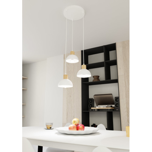 Modern pendant lamp in Scandinavian style from the series Seco, made of a white colour round metal base and three white metal shades in a dome shape with decorative natural wooden elements on top. Stylish hanging lamp, suitable for original lighting in your living room, dining room, bedroom, hotel or restaurant.