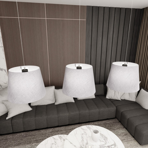 Elegant pendant lamp from the series Epoca, made of a black colour rectangular metal base and three textile shades in grey colour. A great idea for comfortable lighting in your living room, dining room, bedroom, hotel and restaurant.