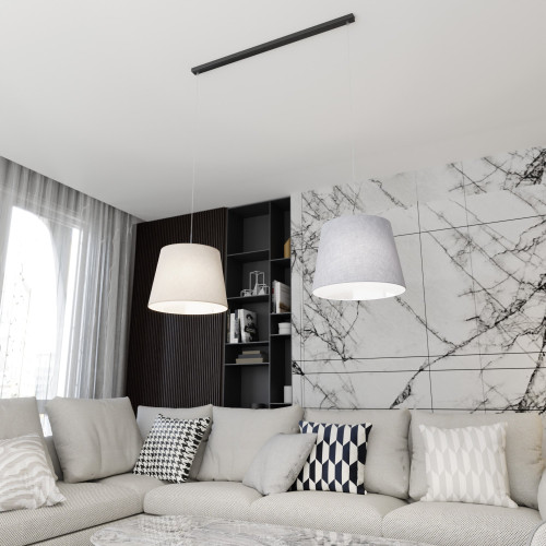 Elegant pendant lamp from the series Epoca, made of a black colour rectangular metal base and two textile shades in grey and beige colour. A great idea for comfortable lighting in your living room, dining room, bedroom, hotel and restaurant.