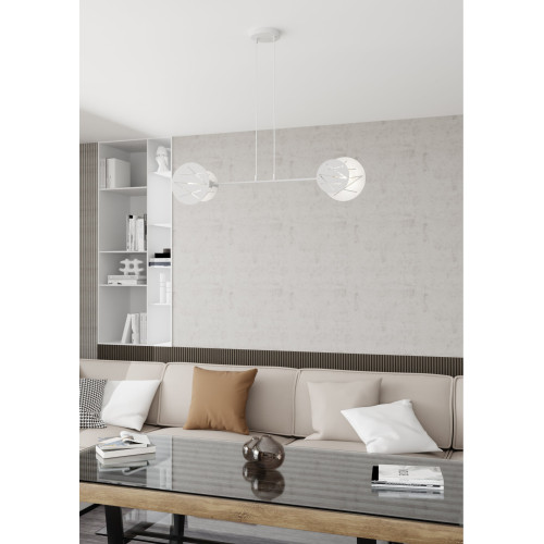 Stylish pendant lamp with a geometric design from the series Xotic, made of a white colour metal base with arms and two light sources on an E27 socket, surrounded by round white metal discs with slots. Original lamp, suitable for comfortable lighting in your living room, dining room, hotel and restaurant.