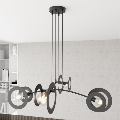 Stylish pendant lamp with a unique design from the series Euforia, made of a black colour round metal base with curved arms and four light sources on an E27 socket, surrounded by black metal rings. Modern proposal for comfortable lighting in your living room, dining room, bedroom, hotel and restaurant.