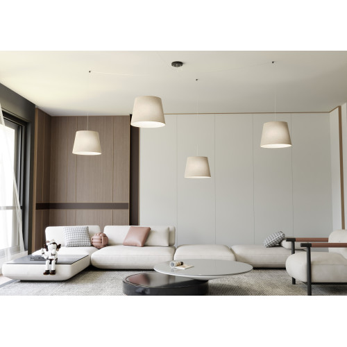 Modern pendant lamp with an elegant design from the series Ascot, made of a black colour round metal base with hanging cables that can be installed at different distances and heights using fastening elements and four textile shades in beige colour. Hanging lamp suitable for comfortable interior lighting in your living room, dining room, bedroom, hotel and restaurant.
