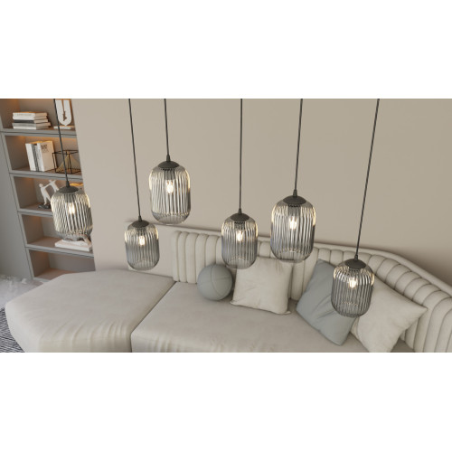 Modern pendant lamp with a stylish design from the series Verdi, made of a black colour rectangular metal base and six cylindrical ribbed glass shades in graphite colour. An original solution for interior lighting in your living room, dining room, office, hotel and restaurant.