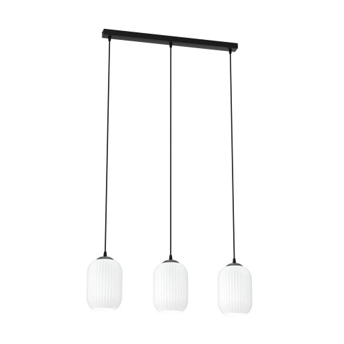 Modern pendant lamp with a stylish design from the series Verdi, made of a black colour rectangular metal base and three cylindrical ribbed glass shades in opal white colour. An original solution for interior lighting in your living room, dining room, office, hotel and restaurant.