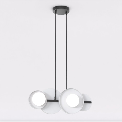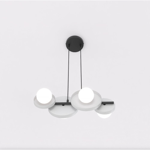 Stylish pendant lamp with a unique design from the series Model, made of a black colour metal base and a geometric body, consisting of four round metal shades in grey colour and opal glass diffusers on a G9 socket. Modern proposal for the interior lighting of your living room, dining room, office, hotel and restaurant.