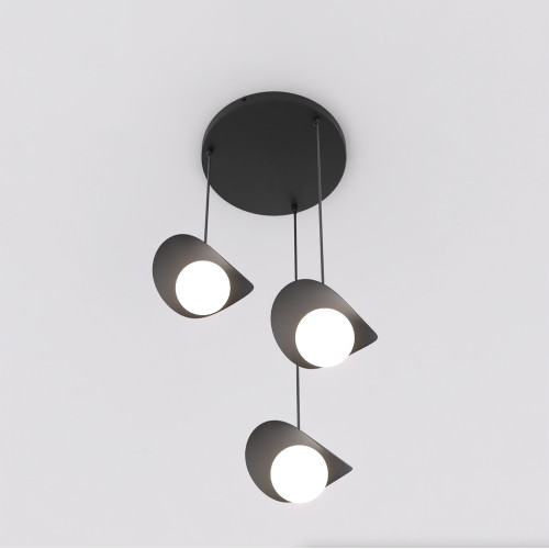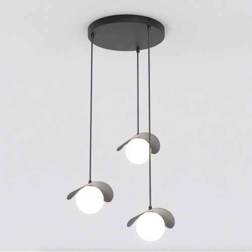 Modern pendant lamp with minimalist design from the series Ritual, made of black colour metal base and three curved metal shades with opal glass spherical diffusers. An original solution for interior lighting in your living room, dining room, hotel and restaurant.