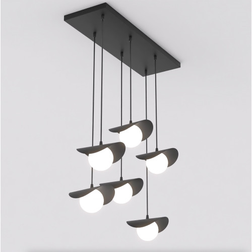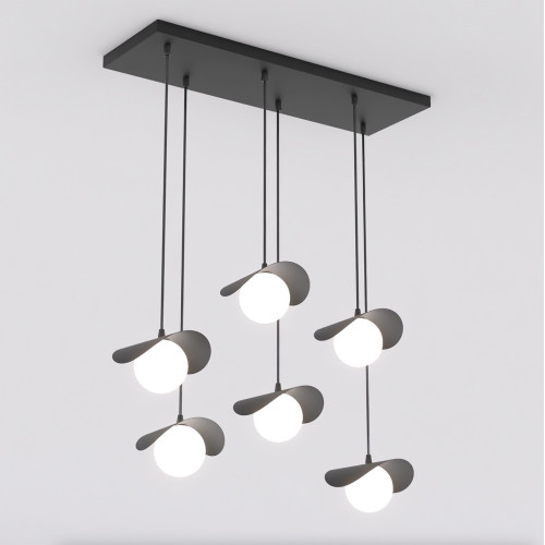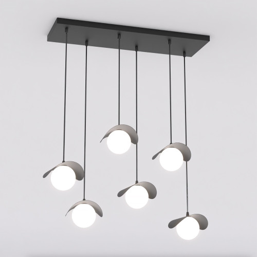 Modern pendant lamp with minimalist design from the series Ritual, made of black colour metal base and six curved metal shades with opal glass spherical diffusers. An original solution for interior lighting in your living room, dining room, hotel and restaurant.