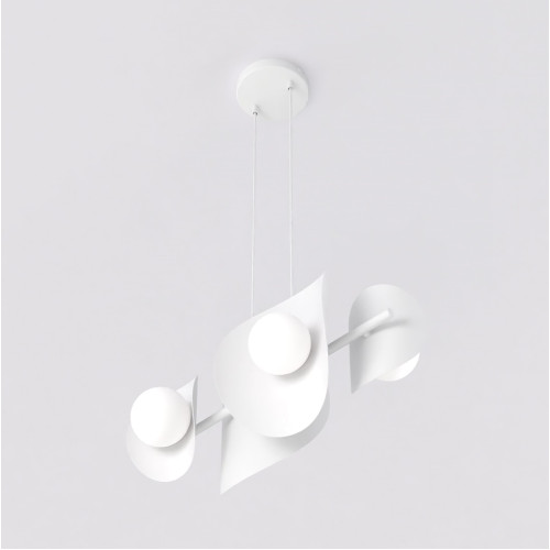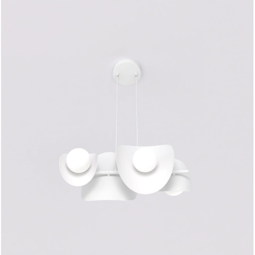 Attractive pendant lamp in a modern style from the series Elementi, made of white colour metal base and arm with four asymmetrical metal bodies in white colour and opal glass shades in spherical shape. Original designer lamp, suitable for interior lighting of your living room, dining room, office, hotel and restaurant.
