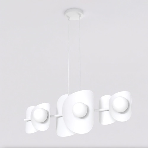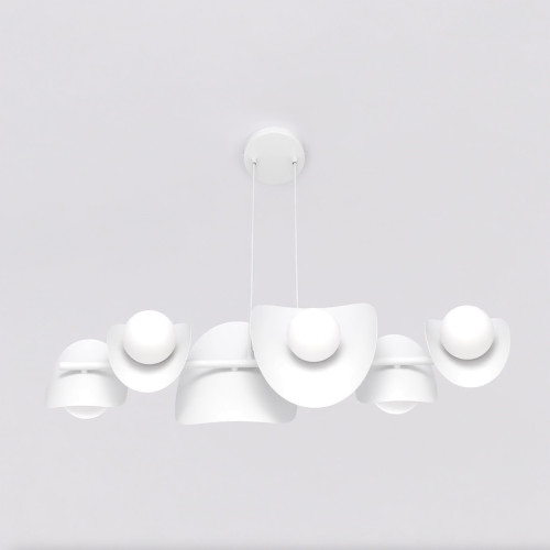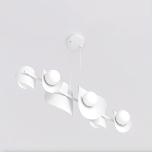 Attractive pendant lamp in a modern style from the series Elementi, made of white colour metal base and arm with six asymmetrical metal bodies in white colour and opal glass shades in spherical shape. Original designer lamp, suitable for interior lighting of your living room, dining room, office, hotel and restaurant.