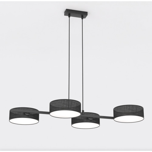 Modern pendant lamp with a stylish design from the series Drumz, made of black colour metal base and four cylindrical textile shades in black colour. An original proposal for comfortable lighting in your living room, dining room, hotel and restaurant.