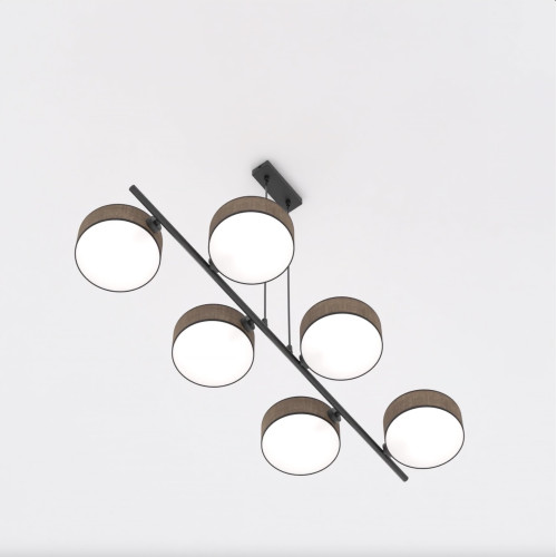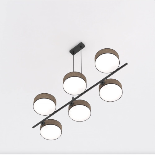 Modern pendant lamp with a stylish design from the series Drumz, made of black colour metal base and six cylindrical textile shades in brown colour. An original proposal for comfortable lighting in your living room, dining room, hotel and restaurant.