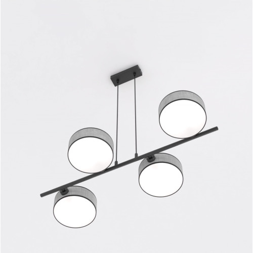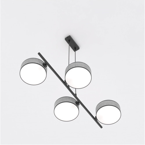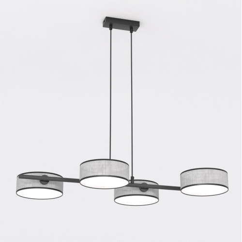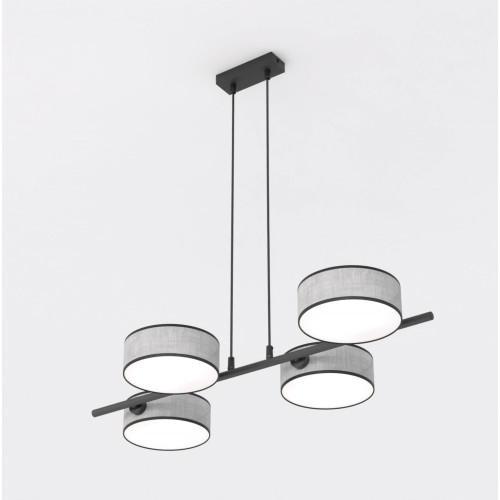 Modern pendant lamp with a stylish design from the series Drumz, made of black colour metal base and four cylindrical textile shades in grey colour. An original proposal for comfortable lighting in your living room, dining room, hotel and restaurant.
