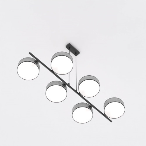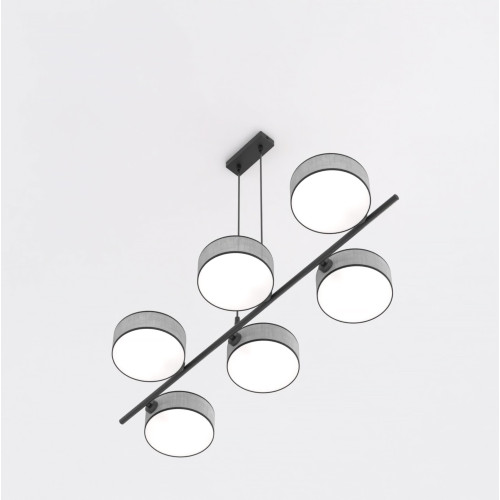 Modern pendant lamp with a stylish design from the series Drumz, made of black colour metal base and six cylindrical textile shades in grey colour. An original proposal for comfortable lighting in your living room, dining room, hotel and restaurant.