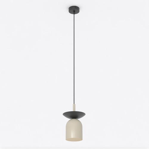 Modern pendant lamp in a minimalist style from the series Ego, made of a round metal base with beige colour oval metal shade and black decorative element on top. Stylish proposal for comfortable lighting in your living room, dining room, hotel and restaurant.
