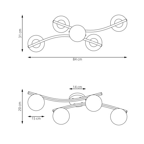 Dimensions: Height: 200mm, Length: 840mm, Width: 310mm, Diameter of the shades: 150mm, Diameter of the base: 140mm
