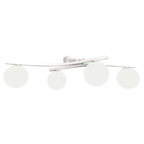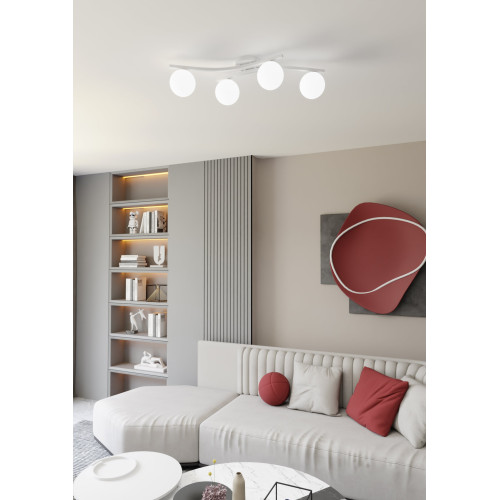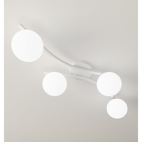 Elegant ceiling lamp with a minimalist design from the series Opus, made of a white colour metal base and arms with four spherical glass shades in opal colour. A great idea for interior lighting in your living room, dining room, bedroom, hallway, hotel and restaurant.