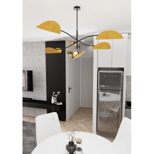Stylish chandelier with an attractive design from the series Lotus, made of black colour metal base and adjustable arms with six original diffusers of plastic covered with textile in yellow colour. Modern lamp, suitable for the comfortable lighting of your living room, dining room, bedroom, hotel and restaurant.