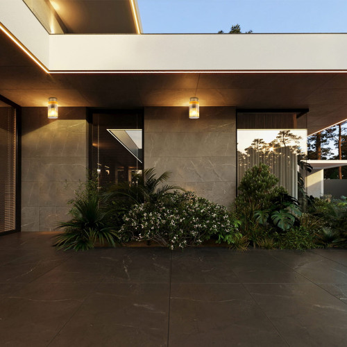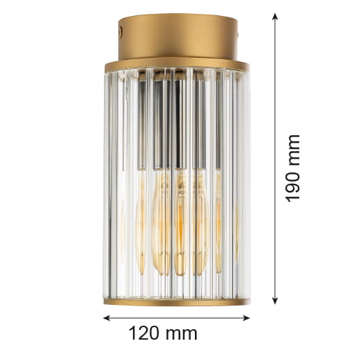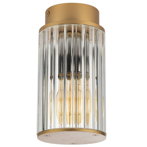 Stylish facade surface mounting lamp from the series Norfolk, made of a gold colour aluminium base and a transparent ribbed glass shade in a cylindrical shape. Modern lamp with a high degree of ingress protection: IP44, suitable for quality outdoor lighting of your facade, porch and terrace.