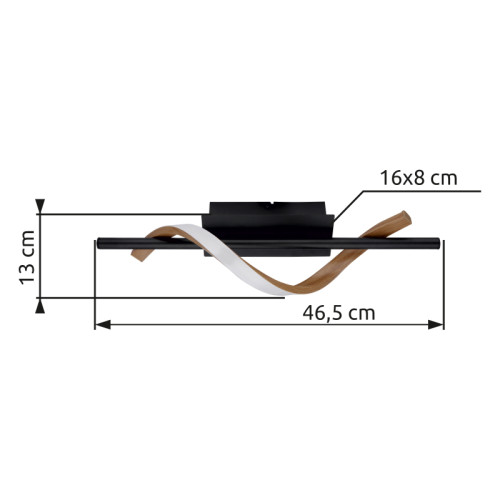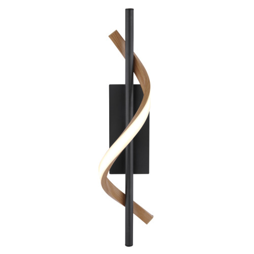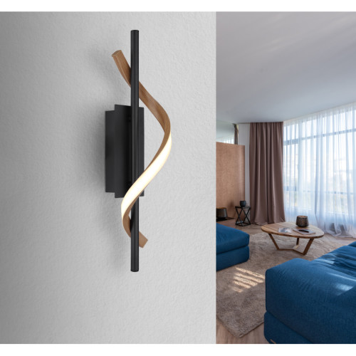 Modern LED wall lamp from the series Watkins, made of a matt black colour metal base and arm with a curved aluminium body in brown colour with a wood effect and a white plastic diffuser with a built-in 12.5W 3000K LED. An original proposal for the interior lighting of your living room, dining room, bedroom, hotel and restaurant.