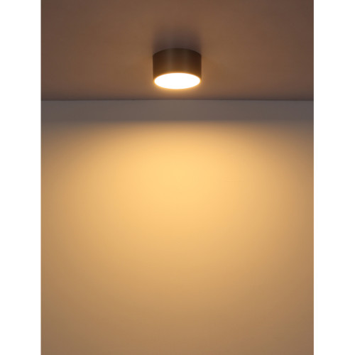 Stylish LED surface mounting lamp from the series Raymond, made of a cylindrical plastic body in matt gold colour with a white plastic diffuser and a built-in 12W 3000K LED. Modern solution for the interior lighting of your living room, dining room, bedroom, hallway, hotel and restaurant.