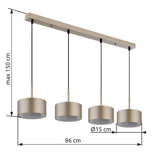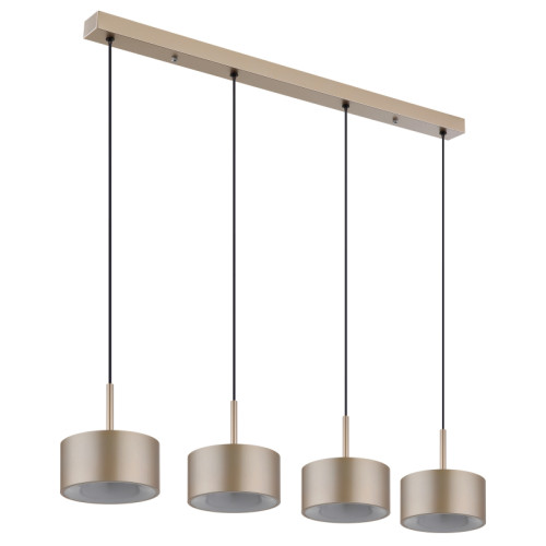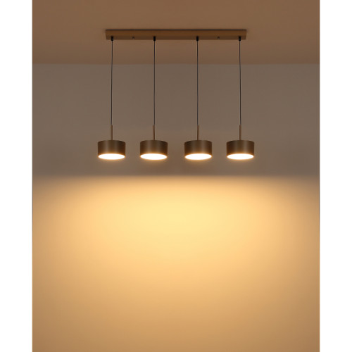 Stylish LED pendant lamp from the series Raymond, made of a rectangular metal base and four cylindrical plastic shades in matt gold colour with white plastic diffusers and a built-in 40W 3000K LED. Modern solution for the interior lighting of your living room, dining room, hotel and restaurant.