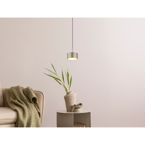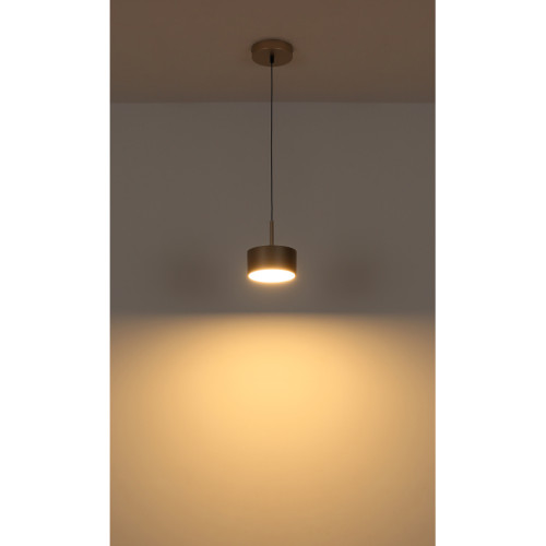 Stylish LED pendant lamp from the series Raymond, made of a round metal base and cylindrical plastic shade in matt gold colour with white plastic diffuser and a built-in 12W 3000K LED. Modern solution for the interior lighting of your living room, dining room, hotel and restaurant.