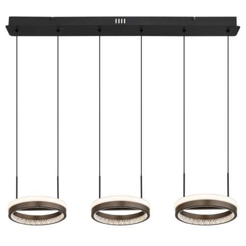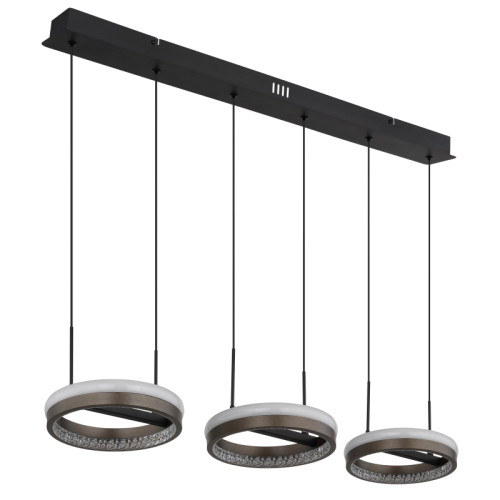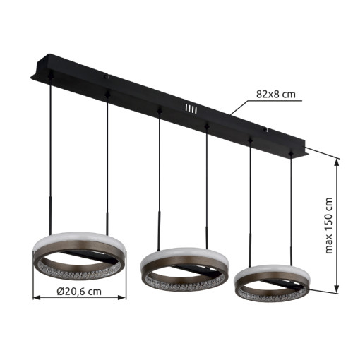 Modern LED pendant lamp from the series Della, made of matt black colour metal base and three dark grey aluminium rings with white plastic diffusers and clear plastic crystals with built-in 40W LED and the ability to select the colour temperature: 3000K/4000K/6000K and built-in dimmer. Quality lamp, suitable for the interior lighting of your living room, dining room, hotel and restaurant.