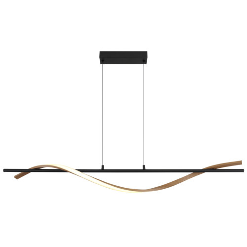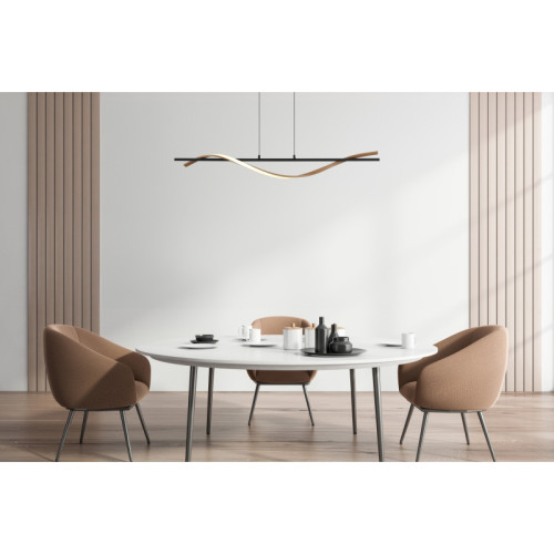 Modern LED pendant lamp from the series Watkins, made of a matt black colour metal base and arm with a curved aluminium body in brown colour with a wood effect and a white plastic diffuser with a built-in 30W 3000K LED. An original proposal for the interior lighting of your living room, dining room, hotel and restaurant.