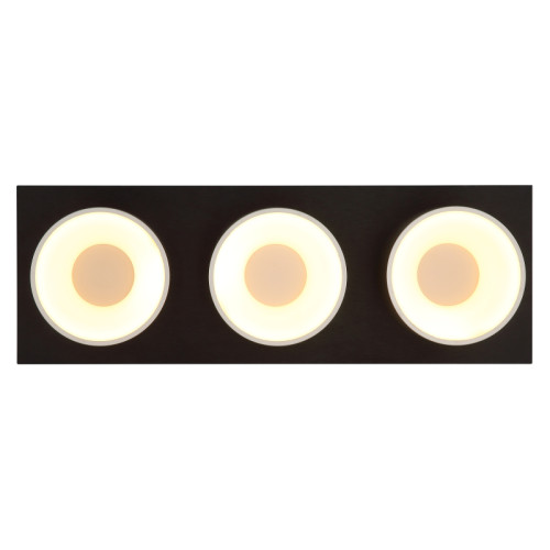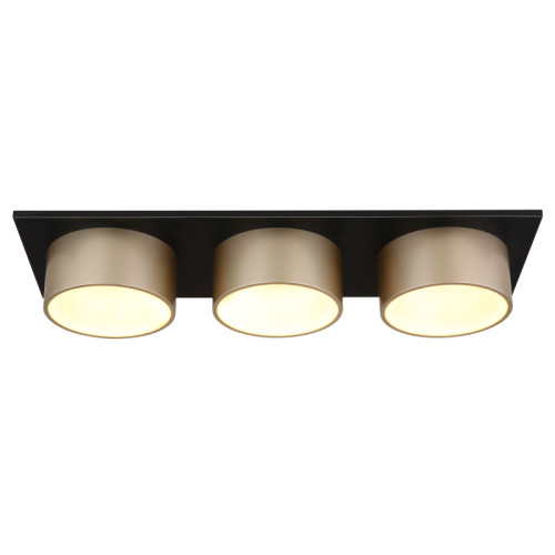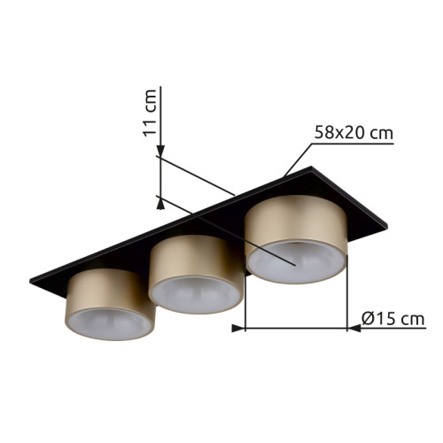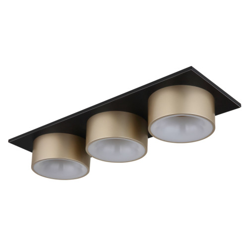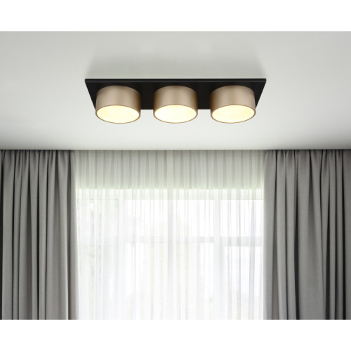 Stylish LED ceiling lamp from the series Raymond, made of a black matt colour rectangular metal base and three cylindrical plastic shades in matt gold colour with white plastic diffusers and a built-in 24W 3000K LED. Modern solution for the interior lighting of your living room, dining room, bedroom, hallway, hotel and restaurant.