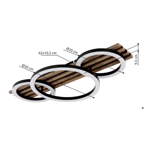 Modern LED ceiling lamp from the series Tisha, made of matt black colour rectangular metal base with MDF wooden elements and three matt black plastic rings with white plastic diffusers and built-in 24W 3000K LED. Original proposal for the interior lighting of your living room, dining room, bedroom, hallway, hotel and restaurant.