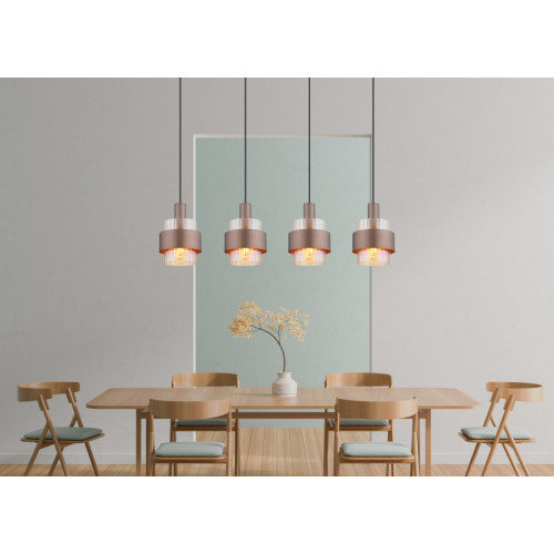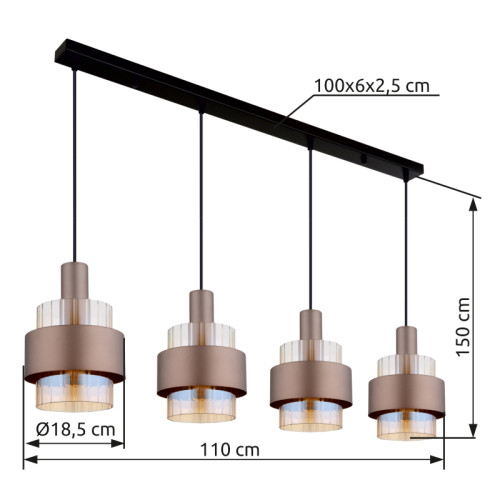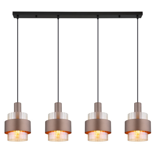 Modern pendant lamp from the series Milley, made of a black matt colour metal base and four cylindrical metal shades in bronze colour with amber glass diffusers with a clear gradient finish. Stylish lamp, suitable for interior lighting of your living room, dining room, bedroom, hotel and restaurant.