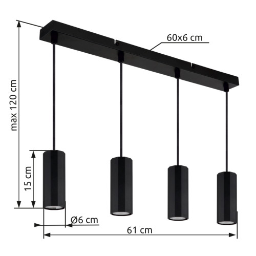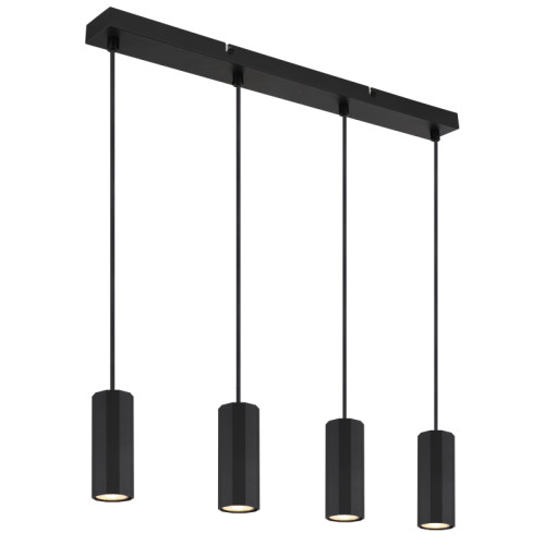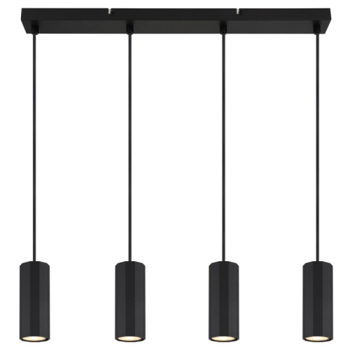 Modern pendant lamp from the series James, made of a matt black colour rectangular metal base and four cylindrical aluminium shades on a GU10 socket. Stylish solution for the interior lighting of your living room, dining room, hotel and restaurant.