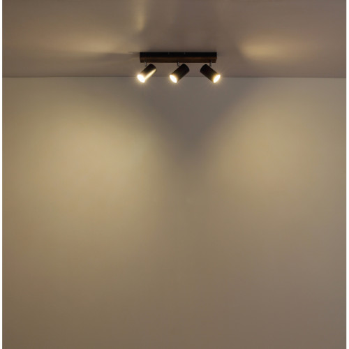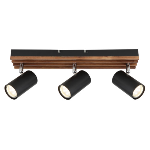 Original spot lamp from the series Kayden, made of a matt black colour metal base with decorative wooden elements and three adjustable metal heads in a cylindrical shape on a GU10 socket. Functional lamp, suitable for modern and comfortable lighting of your living room, dining room, bedroom, hallway, hotel and restaurant.