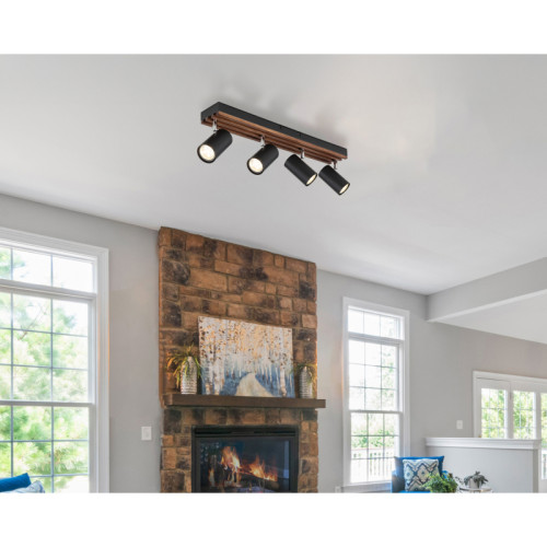 Original spot lamp from the series Kayden, made of a matt black colour metal base with decorative wooden elements and four adjustable metal heads in a cylindrical shape on a GU10 socket. Functional lamp, suitable for modern and comfortable lighting of your living room, dining room, bedroom, hallway, hotel and restaurant.