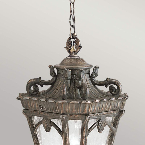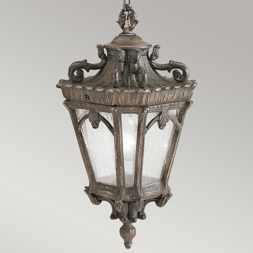 Unique garden pendant lamp with magnificent design, made of antique bronze colour aluminium base with chain, hand-made cast aluminium body with ornaments and transparent glass panels in the shape of a lantern. Classic lamp, which will bring sophistication and cozy light to any garden, porch and terrace in your stylish home, villa, hotel and restaurant.