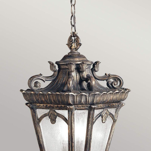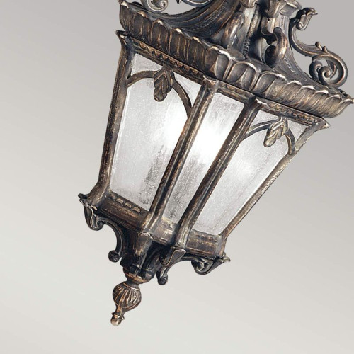 Unique garden pendant lamp with magnificent design, made of antique bronze colour aluminium base with chain, hand-made cast aluminium body with ornaments and transparent glass panels in the shape of a lantern. Classic lamp with high degree of increase protection: IP44, which will bring sophistication and cozy light to any garden, porch and terrace in your stylish home, villa, hotel and restaurant.