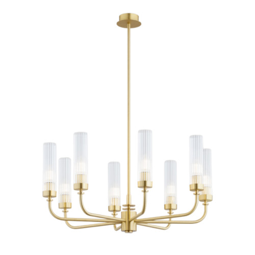 Magnificent chandelier with a stylish design from the series Preston, made of a brass colour metal base and metal arms with eight transparent ribbed glass shades in a cylindrical shape. A classic hanging lamp, suitable for comfortable and sophisticated lighting in your living room, dining room, bedroom, foyer, hotel and restaurant.