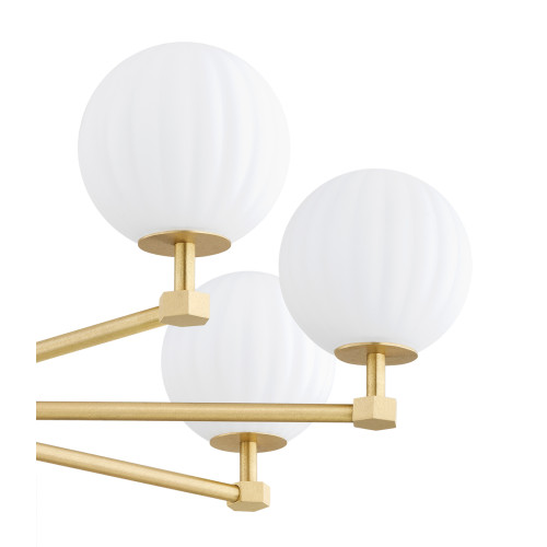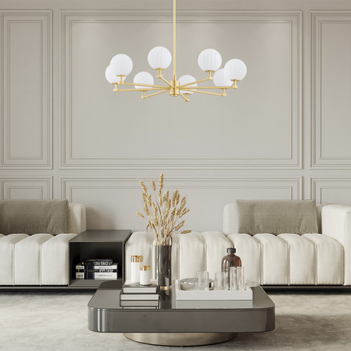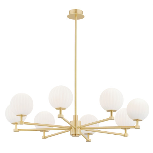 Stylish chandelier from the series Paloma, made of brass base with eight straight arms and spherical shaped shades of opal matt fluted glass. A sophisticated proposal for the quality and comfortable lighting of your living room, dining room, bedroom, hotel and restaurant.