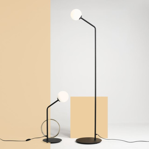 Stylish floor lamp with a minimalist design from the series Pure, made of a black matt colour round metal base with arm and white matt colour spherical glass shade on an E14 socket. An original proposal for comfortable and modern lighting for your living room, dining room, bedroom, hotel and restaurant.