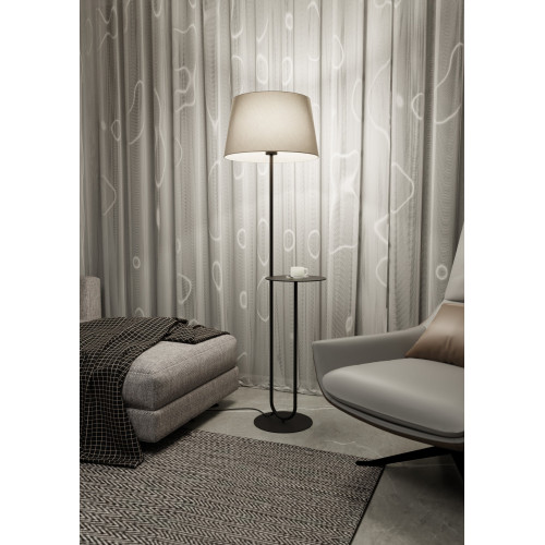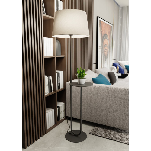 Modern floor lamp with functional design from the series Hotel, made of black colour metal base and arms with practical metal shelf and beige colour textile shade. An original proposal for comfortable lighting in your living room, dining room, bedroom and hotel.