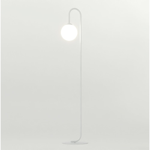 Elegant floor lamp with a modern design from the series Flor, made of a grey colour round metal base with a curved arm and an opal glass shade in a spherical shape. An original proposal for comfortable lighting in your living room, dining room, bedroom and hotel.