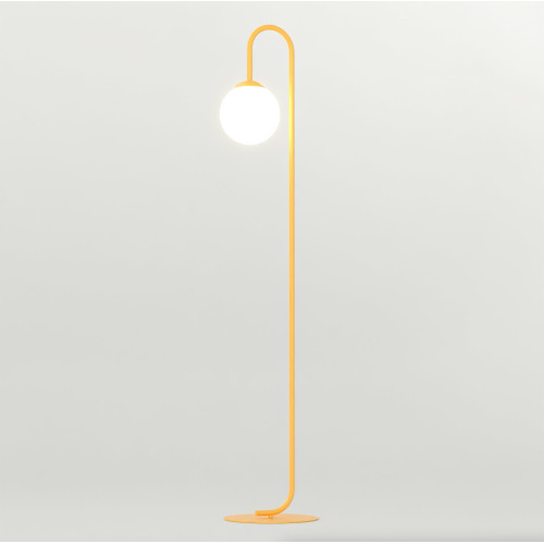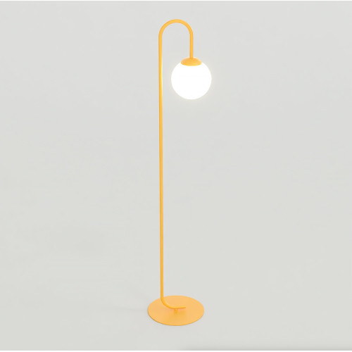 Elegant floor lamp with a modern design from the series Flor, made of an orange colour round metal base with a curved arm and an opal glass shade in a spherical shape. An original proposal for comfortable lighting in your living room, dining room, bedroom and hotel.