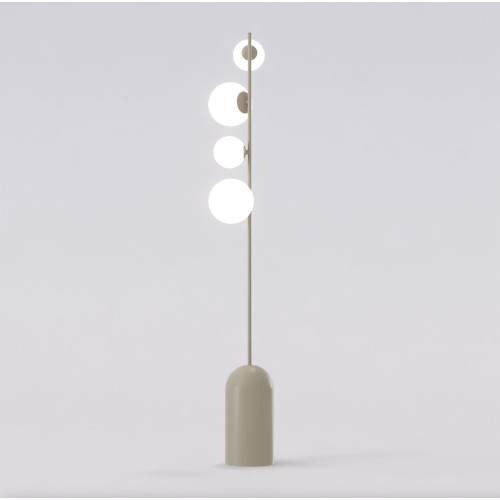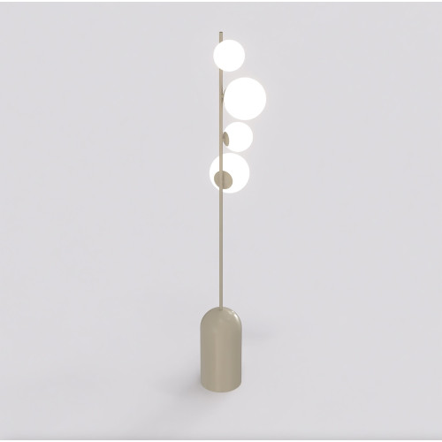 Stylish floor lamp with modern design from the series Etno, made of beige colour metal base and arm with four different sized white glass shades in spherical shape. Original designer lamp, suitable for interior lighting of your living room, dining room, bedroom, office, hotel and restaurant.