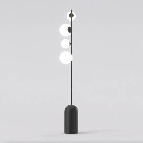 Stylish floor lamp with modern design from the series Etno, made of black colour metal base and arm with four different sized white glass shades in spherical shape. Original designer lamp, suitable for interior lighting of your living room, dining room, bedroom, office, hotel and restaurant.
