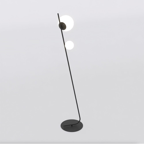 Modern floor lamp with a stylish design from the series Tatu, made of a black colour metal base and arm with two different sized white glass shades in a spherical shape. Great addition to the interior lighting of your living room, dining room, bedroom, hotel and restaurant.